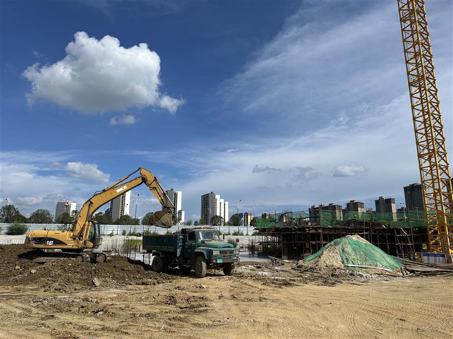 在農(nóng)投思賢幸福加項(xiàng)目,技術(shù)人員測(cè)繪、工人在綁扎鋼筋各作業(yè)面工作人員緊張忙碌地開(kāi)展工作;施工機(jī)械運(yùn)轉(zhuǎn)不停、運(yùn)輸車輛來(lái)回穿梭,一派繁忙景象。