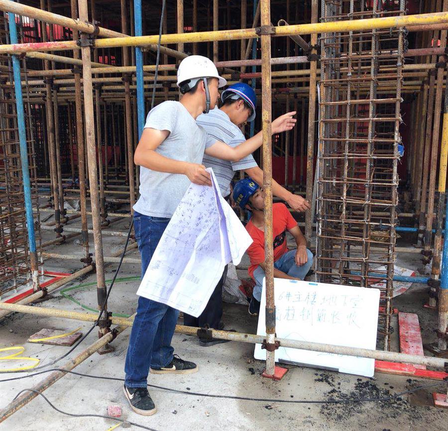 6月18日,在桂華分公司承建的梧州佛子時(shí)代廣場(chǎng)項(xiàng)目現(xiàn)場(chǎng),當(dāng)空烈日讓偌大的工地一片熾熱,焊花飛濺,工程車來(lái)來(lái)往往,工人們揮汗如雨。雖然施工作業(yè)已經(jīng)避開了高溫時(shí)段,但工人們?nèi)员缓顾粤搜劬Γ瑵窳艘路?。盡管這樣,大家仍堅(jiān)持“全副武裝”,手套、防護(hù)用具,安全帽,一樣都沒有少,自覺遵守安全文明施工相關(guān)規(guī)范。入行兩年的施工員趙俊財(cái)抹了一把汗說(shuō)道:“剛參加工作時(shí),不能和家人一起過(guò)節(jié)還挺難受的,后來(lái)把心態(tài)調(diào)整好了,想著只要家人安好,其實(shí)比什么都重要,趁著年輕,還是應(yīng)該多奮斗?!笨粗幻装舜髠€(gè)的他手拿圖紙和卷尺,蜷縮著身子,蹲在空間有限且熱得發(fā)燙的平臺(tái)上仔細(xì)檢查剛剛綁扎好的鋼筋籠,驕陽(yáng)烤得他黝黑的皮膚泛出一層水光,襯著那還略顯年輕的臉龐,顯得熠熠生輝。