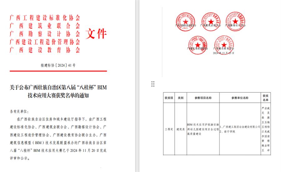 近日,廣西第八屆“八桂杯”BIM技術(shù)應用大賽獲獎名單公布,冶建公司基礎分公司申報的《BIM 技術(shù)應用護航融安融洲幼兒園建設項目全過程高質(zhì)量建設》榮獲施工組建筑類二等獎。