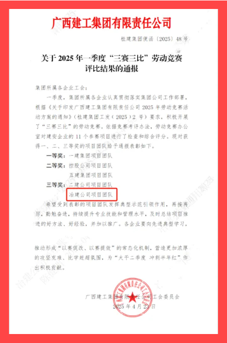 4月23日,集團(tuán)公司工會通報(bào)2025年一季度“三賽三比”勞動競賽評比結(jié)果,冶建公司項(xiàng)目團(tuán)隊(duì)在11個建安企業(yè)參賽項(xiàng)目中榮獲三等獎,彰顯了項(xiàng)目團(tuán)隊(duì)務(wù)實(shí)高效、團(tuán)結(jié)協(xié)作、拼搏進(jìn)取的精神風(fēng)貌。