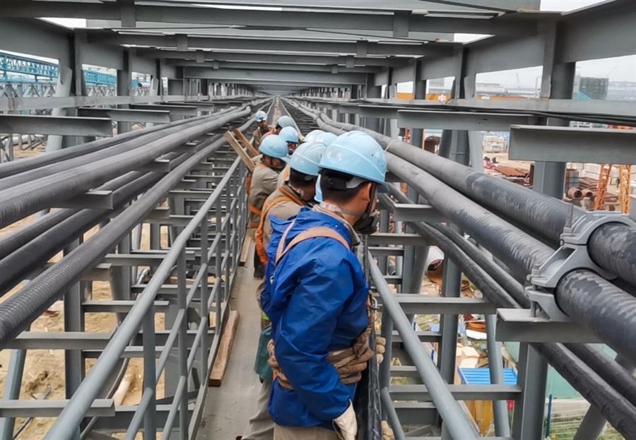 在防城港鋼鐵基地項(xiàng)目(一期)動(dòng)力系統(tǒng)電力設(shè)施工程——10kV電力電纜敷設(shè)項(xiàng)目施工現(xiàn)場(chǎng),工人們各司其職、齊心協(xié)力,努力推進(jìn)項(xiàng)目建設(shè)。